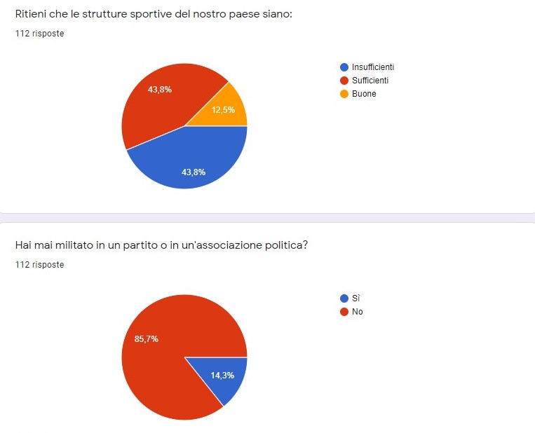 Il 77% del campione ha praticato degli sport, ma le strutture vengono giudicate come insufficienti dal 44.2%, sufficienti dal 43.4% e buone dal 12.4%.