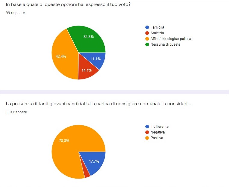 Alcune risposte hanno confermato quanto già sapevamo: per esempio, che i giovani non militano in partiti e associazioni politiche (l'85% dei nostri interlocutori dice che non lo ha fatto finora, più del 70% dice che non lo farà neanche in futuro); oppure che la maggior parte dei ragazzi abbia votato alle scorse elezioni amministrative, un dato che potevamo immaginare vista l'alta affluenza e la consistente presenza di giovani candidati (presenza giudicata positivamente dalla qua-si totalità di chi ha partecipato al questiona-rio).